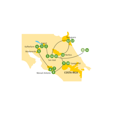 <Nach dem Frühstück folgst du dem Kaffeeduft und erreichst so schon bald die Familie Bello, die eine ökologische Kaffeefarm betreibt. Ein Familienmitglied erzählt dir auf einem Rundgang über die Finca viel Interessantes über Kaffeeanbau und die Geschichte des Kaffees. Nach der Theorie folgt die Praxis. Im vom Urgroßvater erbauten Haupthaus erwartet dich duftender Kaffee, köstlich zubereitet im costaricanischen Chorreador. Und weil es inzwischen Mittagszeit ist, gibt es dazu hausgemachte Spezialitäten zum Probieren. Gestärkt geht es weiter bis zu deinem Tagesziel, dem Nebelwald Monteverde.