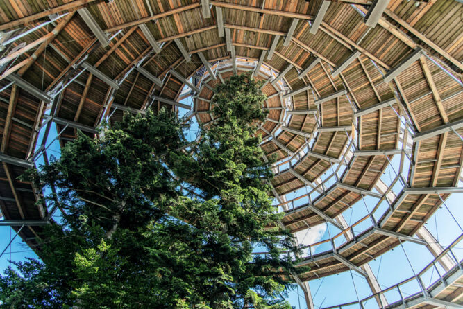 - Der eindrucksvolle Turm des Baumwipfelpfads führt spiralförmig nach oben.