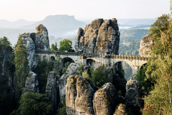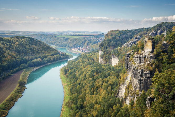 Über weite Teile des Elbsteingebirges erstreckt sich der Nationalpark Sächsische Schweiz. Charakteristisch sind die bizarren Felsformationen, die dieses Gebirge ausmachen. Hier kannst du durch tiefe Schluchten wandern, die sich in das Gestein graben. Alte Festungen wie Königstein thronen auf den Erhebungen. Die Sächsische Schweiz zählt zu den einzigartigsten Landschaften Deutschlands.