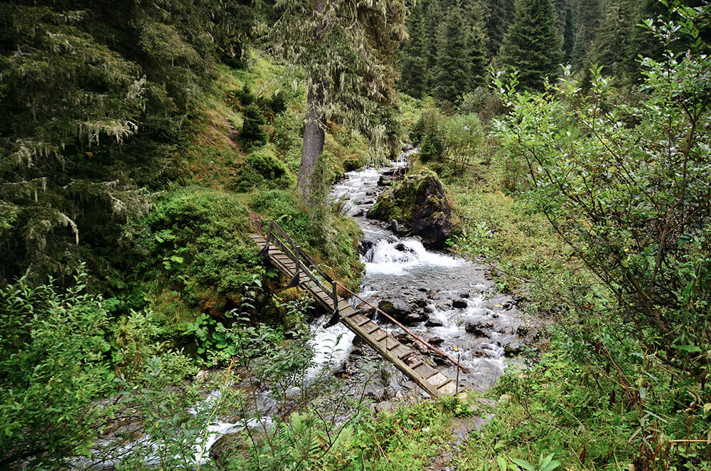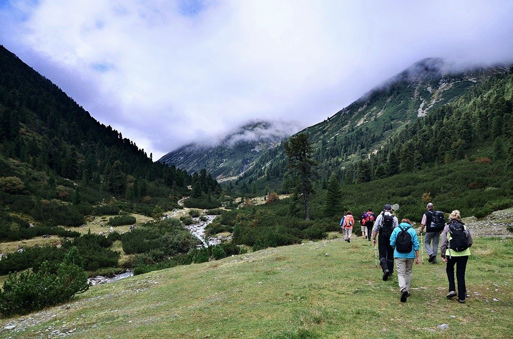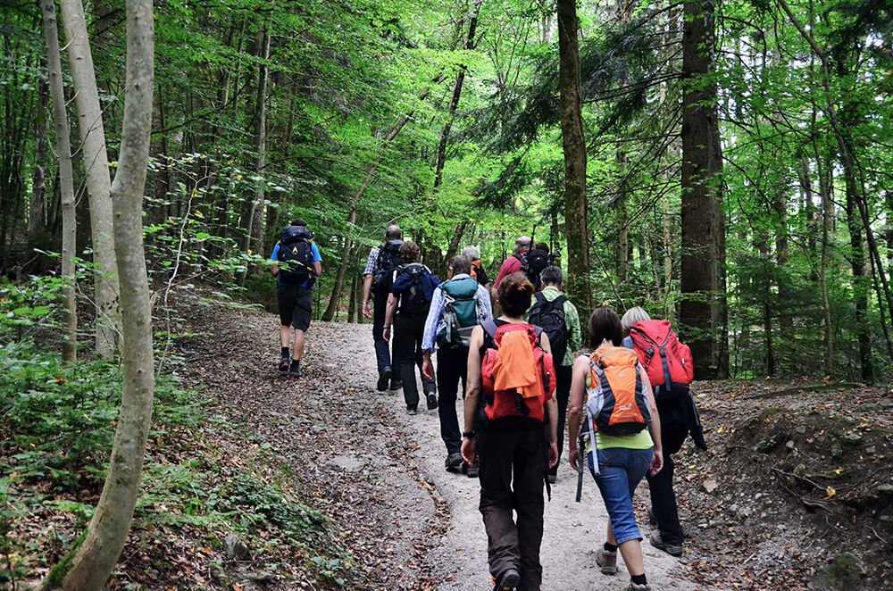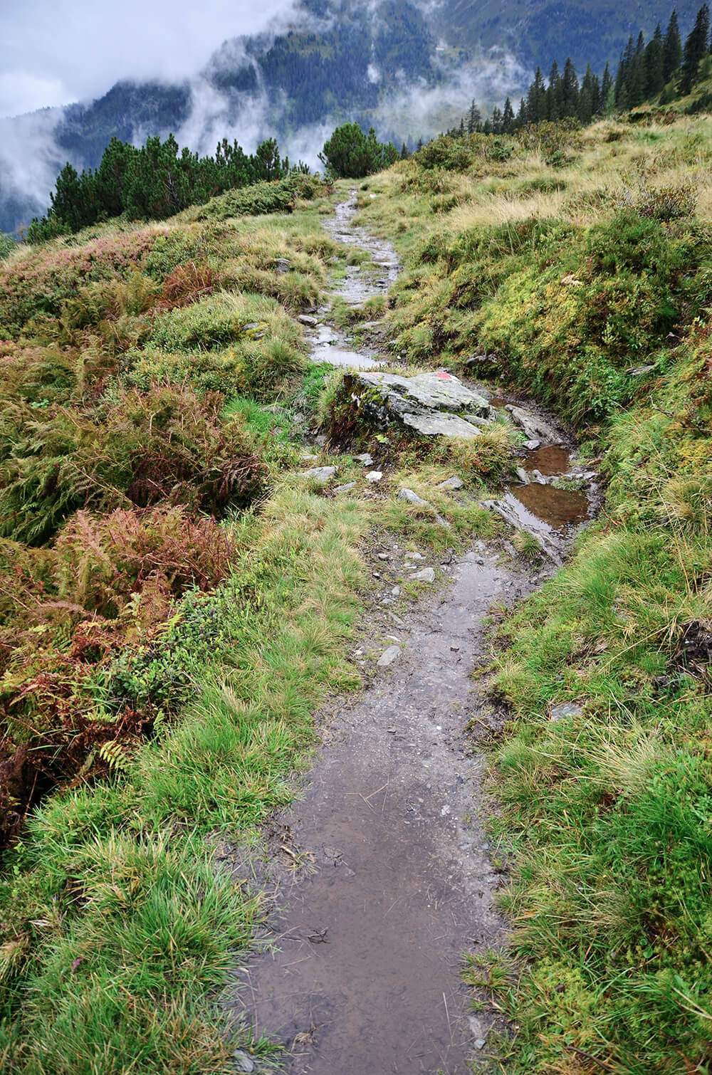 Den zweiten Tag musste unser Wanderführer Daniel dann leider auch schon umplanen, da es ununterbrochen regnete und der Starkregen in der Nacht zuvor einige Wege unpassierbar machte. Aber Daniel, ganz wie ein „alter Hase“, ließ sich nie aus der Ruhe bringen und hatte immer einen „Plan B“ parat. Also brachte er uns umsichtig und sicher über eine Ausweichroute nach Österreich.