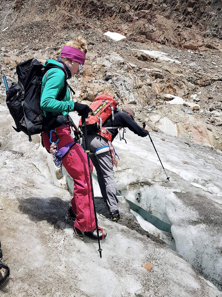Julia war zum ersten Mal in einer Gletscherspalte. Eine beeindruckende Erfahrung für die Hochtourenkurs-Teilnehmerin. Bei der ihr klar geworden ist, dass es auch bei Hochtouren im Sommer wichtig ist, sich warm anzuziehen. Denn sollte man wirklich mal in einer Gletscherspalte stecken, kommt man im T-Shirt kaum ohne Verletzungen und Unterkühlung davon. Wie in Julias Situation kann es passieren, dass der Körper direkt am Eis liegt, da die Spalte keinen Platz für große Bewegung oder Ausweichmöglichkeiten gibt. Eine lehrreiche Erfahrung war es für Julia auch, einmal einen Spaltensturz zu halten. Gar nicht so leicht – besonders dann, wenn man nicht darauf vorbereitet ist.
