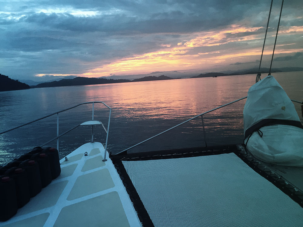 Nach einer 5-stündigen Busfahrt nach Ranong setzen wir über mit dem Longtailboot und erreichen schließlich die „SIMILE“, unser „Home for the next days“, wie unser südafrikanischer Skipper Mike treffend verkündet, als wir den Segelcatamaran entern. Wir sind eine bunte internationale Truppe – alle gespannt, wie es wohl wird für 8 Tage auf so engen Raum 24h zusammen zu sein. Sämtliche Zweifel, dass das gut gehen wird, verfliegen nach den ersten Metern auf dem Wasser. Wir lassen uns direkt in die Sitz-Beanbags auf dem Vorderdeck fallen und diese sollten in den nächsten Tagen zu unserem Wohnzimmer werden – unter dem Sonnensegel genießen wir den Wind und das Salz auf unserer Haut. Unsere Blicke schweifen mit den Wellen ins endlose Blau des Wassers und nach 4h dahingleiten, ist auch der letzte Ruhelose im Slow-Down Modus angekommen.