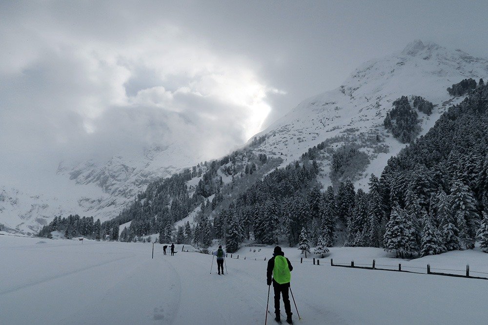 Am zweiten Tag lockte uns 30 cm Neuschnee ins 1.700m hoch gelegene Langlaufgebiet Lüsens/Praxmar im Sellraintal. Schon die Anreise in das tief verschneite Hochtal war ein Erlebnis. Es erwartete uns ein frisch gespurtes Loipennetz, das sich über sanfte Almwiesen, durch romantische Zirbenwälder und entlang gurgelnder Bergbäche schlängelt. Nur wenige Langläufer verirrten sich an diesem Tag nach Lüsens. Mittagsrast hielten wir in der gemütlichen Zirbenstube im Gasthof Praxmar, wo wir mit hervorragender heimischer Küche verwöhnt wurden. Am Nachmittag gab uns die Sonne auch noch den imposanten Ausblick auf den 3.299 m hohen Lüsener Fernerkogel frei.