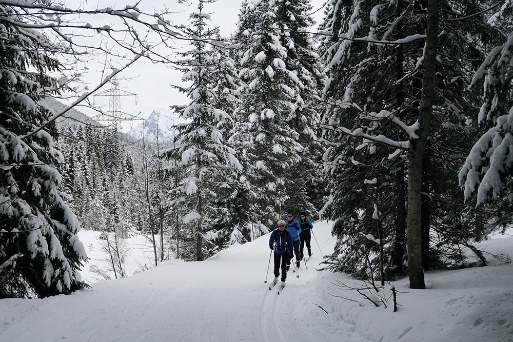 Die Leutasch war das Ziel des vierten Tages. Es ist ein sehr weitläufiges Langlaufgebiet auf eher offenen, flachen Wiesen und Feldern und wunderschön eingerahmt von den Gipfeln des Wettersteingebirges. Nach den Strapazen des Vortages waren wir froh, uns auf den flachen Loipen ein wenig erholen zu können. Ein Zuckerl dieses Tages war die idyllische Waldloipe, die uns über romantisch verschneite Wege direkt zu unserer Mittagsrast, dem zünftigen Dorfstadl in Weidach führte.