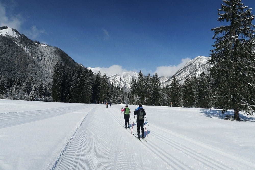 Der fünfte und letzte Tag führte uns bei strahlendem Winterwetter ins Langlaufzentrum nach Pertisau am Achensee. Es liegt am Eingang des Karwendelgebirges und umfasst die drei Karwendeltäler Gerntal, Falzthurntal und Tristenautal. Alle drei Loipen führen von Pertisau aus mit nur mäßigem Anstieg ca 10km bis in den Talschluss und bei leichtem Gefälle wieder zurück nach Pertisau. Sie werden fast durchgehend umrahmt von den imposanten Bergflanken der Karwendelgipfel. Unser Tagesziel war das Gerntal mit der gleichnamigen Alm, die das Herz jedes hungrigen Langläufers und Wanderers höher schlagen lässt. Wir genossen die köstliche Mittagsrast und lernten wieder einmal Interessantes über einheimische Spezialitäten kennen: Kiachl, Krapfen, Knödel, Kaiserschmarrn, Kriacherlschnaps…..