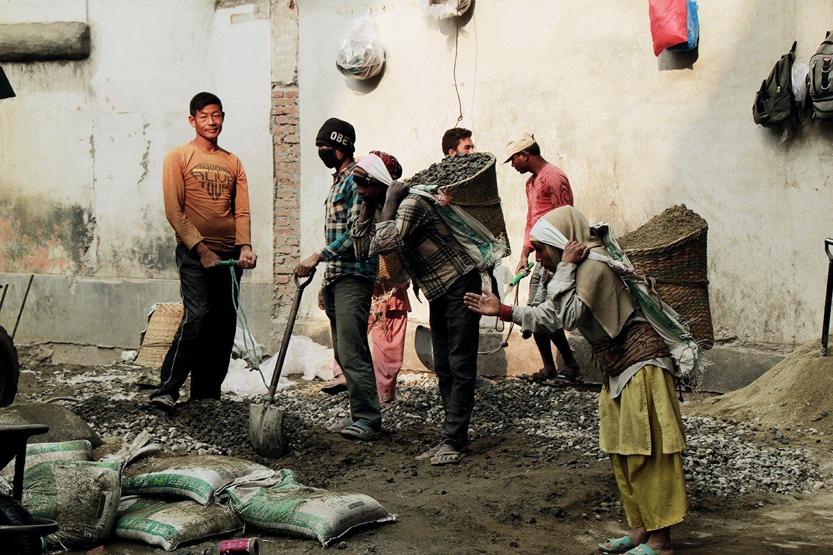- Hausbau in Kathmandu: die traditionellen Träger bringen das Material