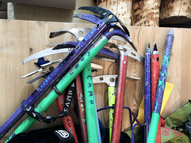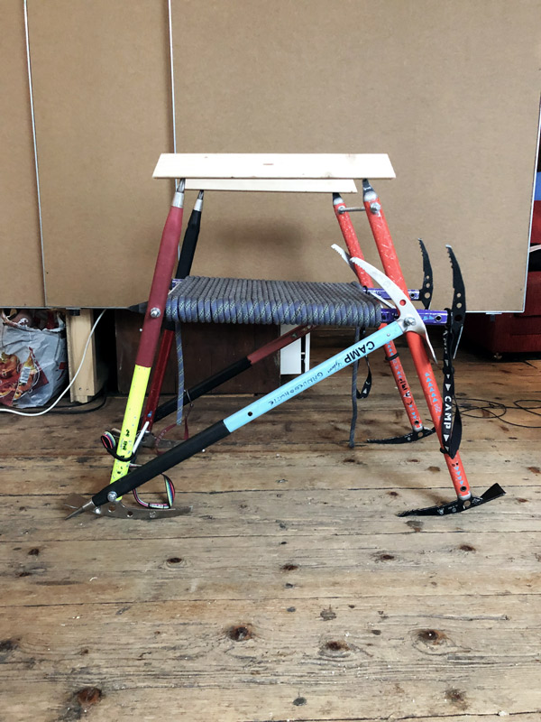 - Aus Eispickeln und Kletterseilen wurde eine individuelle Sitzgelegenheit. Ob das auch bequem ist?
