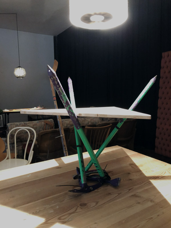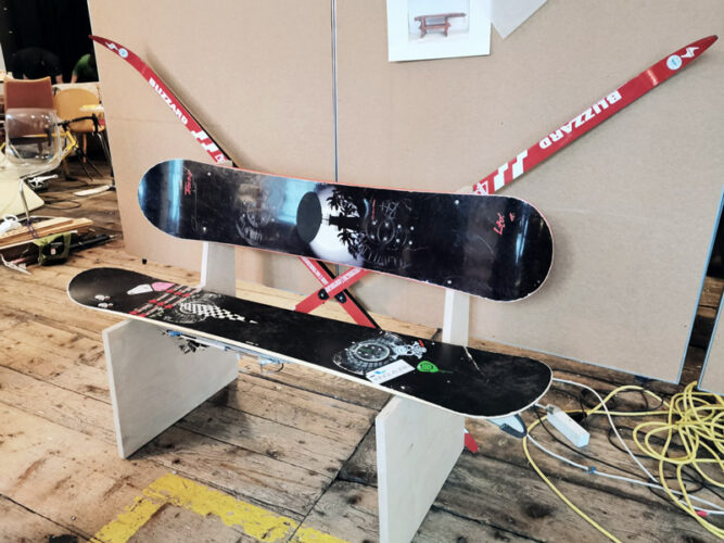 In fast sechs Stunden fleißiger Team-Arbeit haben wir schließlich aus veralteten und nicht mehr funktionstüchtigen Gegenständen etwas Neues, sehr funktionstüchtiges geschaffen. So wurde aus beinahe 30 Jahre alten Eispickeln und in die Jahre gekommenen Kletterseilen ein Stuhl gebaut. Aus Vintage Langlaufskiern und Snowboards bauten wir uns eine Sitzbank und aus alten Schildern und Wandernadeln wurde ein Loungetisch, der mit einer Bergsilhouette geziert wurde.