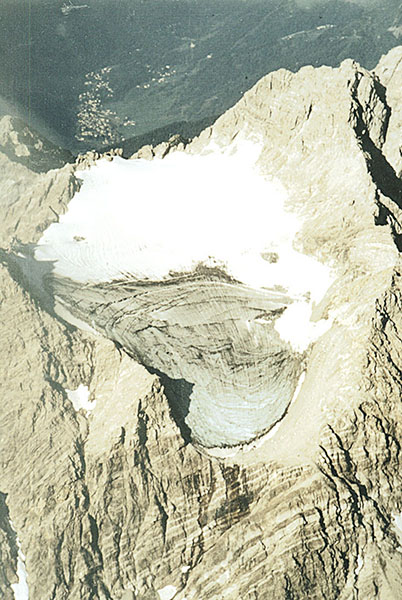 Der Vorderseeferner in den Lechtaler Alpen ist ein typischer Kargletscher, der alle Kriterien erfüllt: Firngebiet, Ablationsgebiet, Spalten, Jahresschichten. Kargletscher werden jeden Winter bis zu ihrer Schwelle mit Lawinen gefüllt. Erwärmung im Sommer macht ihnen wenig aus.