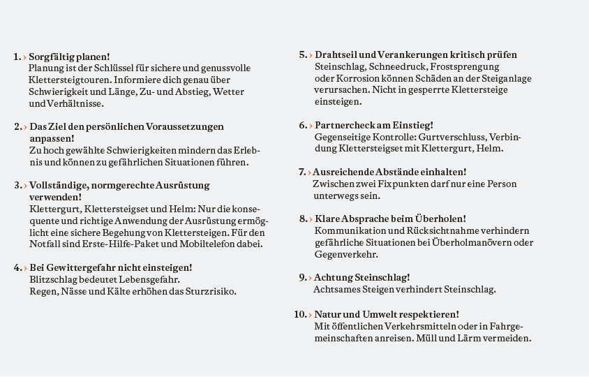 Um das Unfallrisiko bei Klettersteigtouren bestmöglich zu minimieren, hat der Club Arc Alpin [caa], der Dachverband der großen Bergsportverbände des Alpenbogens, im Frühjahr 2011 Empfehlungen zum sicheren Begehen von Klettersteigen verabschiedet – die 10 Klettersteig-Regeln. Kompakt zusammengefasst werden diese hier dargestellt und bilden die Grundlage, um risikobewusst und eigenverantwortlich einen Klettersteig begehen zu können. Zusätzlich zu den theoretischen Grundlagen empfehlen wir jedem Klettersteig-Neuling, sich bei einem unserer Ausbildungskurse von den ASI Bergführern entsprechend instruieren zu lassen.