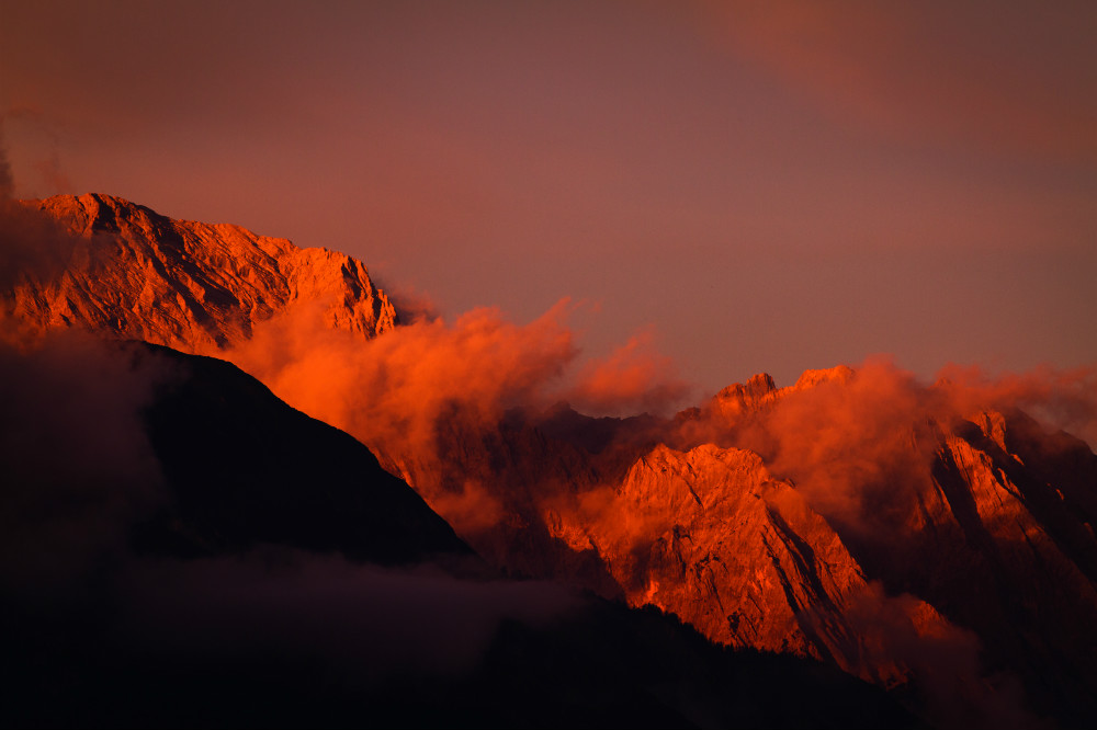 - Wolken und Berg in rot getaucht