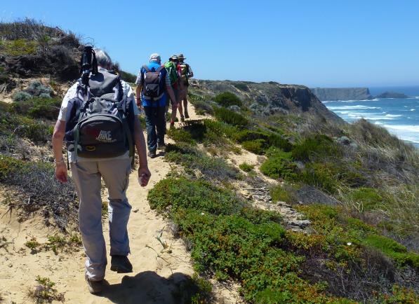 Es ging an die Küste. Diese empfing uns ganz schön stürmisch, der Atlantik zeigte was er kann. Oberhalb eines weiten Flusstales begann unsere Wanderung und führte uns durch blütenreichste Landschaft oberhalb der Steilküste bis Monte Clerigo, wo die Angler ihr Glück in der tosenden Brandung versuchten. Passend zur Gegend stand wieder ein lecker gegrillter Fisch auf unserer Speisekarte, den wir uns nach den 3 Stunden richtig verdient hatten.