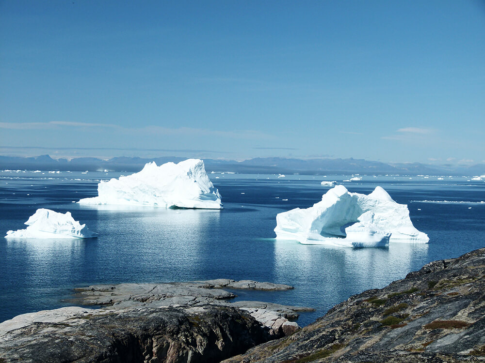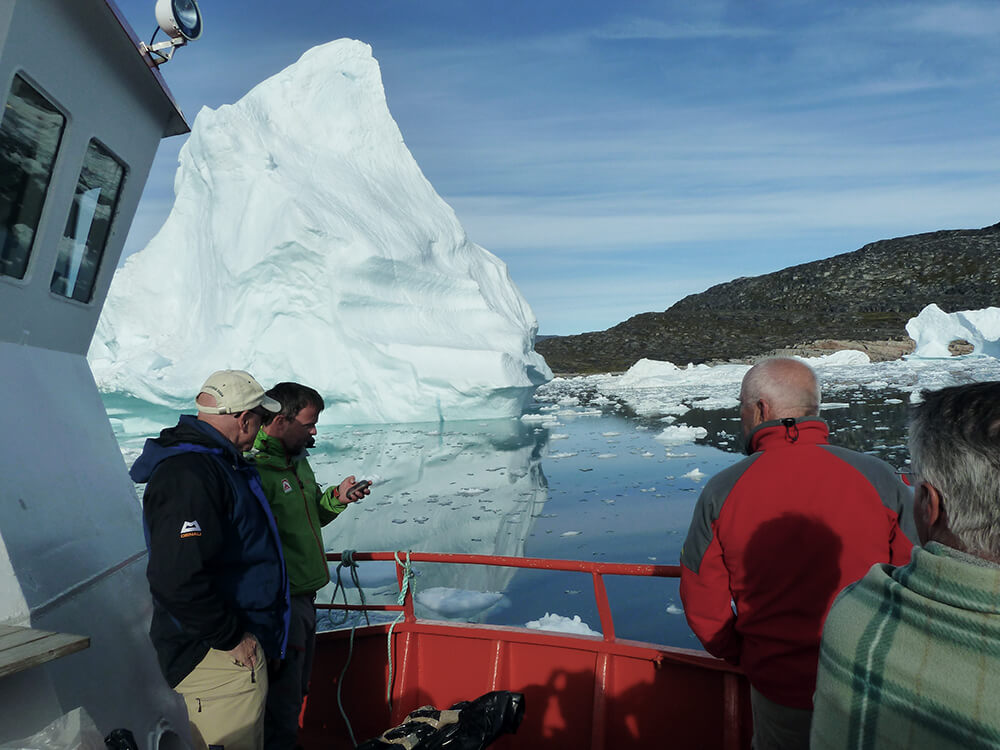 In Grönland bewegt man sich recht bald auf weglosem Gelände ohne Markierungen. Außerhalb der Siedlungsgebiete gibt es nur recht wenig ausgetretene Wege. Den stetigen Blick nach hinten auf den eisfreien Fjord und dem Gipfelpanorama folgt nun unser ganzes Staunen nach vorne. Vor uns der Sermilik-Eisfjord mit einer Länge von 50 km und den gewaltigen Eisbergen. Die Stille wird plötzlich von einem dumpfen Knall unterbrochen und wieder stürzt ein Eisblock unter tosendem Gerumpel in die Tiefe.