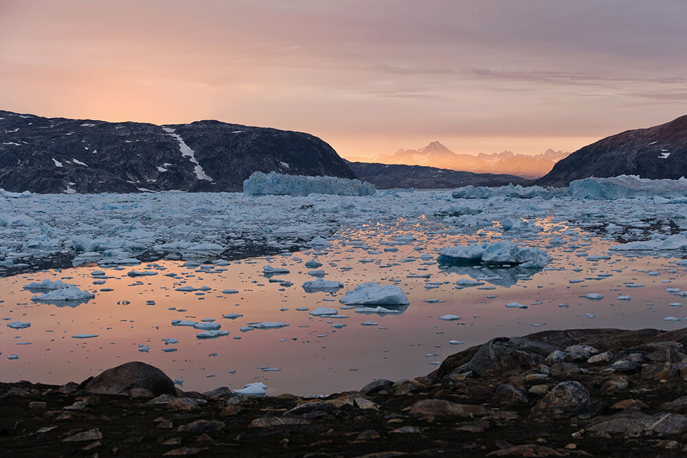 Spätestens jetzt sind wir in Grönland angekommen. Wir wandern im Gleichschritt mit dem Eis dem Fjord entlang, lauschen der Stille und lassen die surreale Umgebung auf uns wirken.