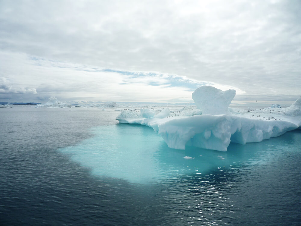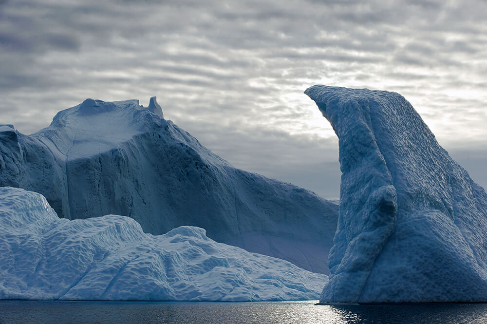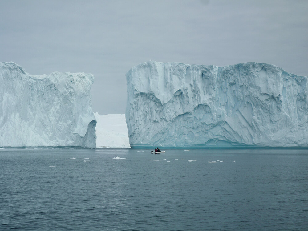 Auf der anderen Seite lässt sich die Größe der 600 km langen Eiswüste nur erahnen. Dort herrscht kein Leben. Eis und Himmel prägen die Landschaften und unzählige heroische aber auch tragische Geschichten von Inlandseisüberquerungen geben eine ungefähres Bild des Lebens dort oben. Vorne hören wir ein Motorboot. Schwierig auszumachen, weil es so winzig erscheint im Kreise der treibenden Eisgiganten – oft mehrere Hundert Meter lang. Vereinzelt sogar kilometerlang. Fünf Prozent aller grönländischen Eisberge kommen aus diesem Fjord, von denen aber nur die obersten 10% aus dem Wasser ragen.
