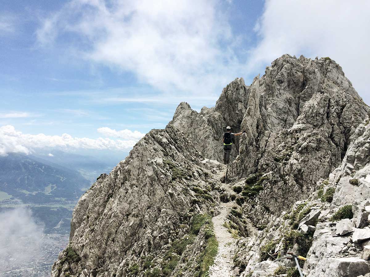 Um 8:30 Uhr geht’s mit der ersten Nordkettenbahn rauf auf’s Hafelekar. Speziell für den Klettersteig bietet die Nordkettenbahn übrigens spezielle Klettersteig-Tickets an. Hinter der Hafelekar-Bergstation geht’s dann Richtung Westen und man erreicht in knapp 10 Minuten den Einstieg des Innsbrucker Klettersteigs oder auch Hannes-Gasser-Klettersteig genannt.