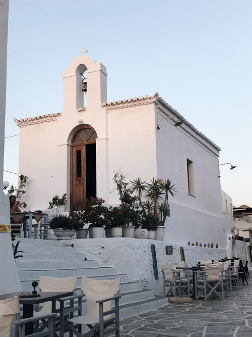 In Chora befindet sich das wunderschöne Hotel Messaria, unsere Bleibe für die nächsten 5 Nächte. Es ist nur 2 Gehminuten vom hübschen Zentrum des Ortes entfernt. Hier schlängeln sich Gassen vorbei an den typisch weiß-blauen Häusern, die von Ladenbesitzern und Gastwirten liebevoll und stylish herausgeputzt sind und zum Einkehren einladen.