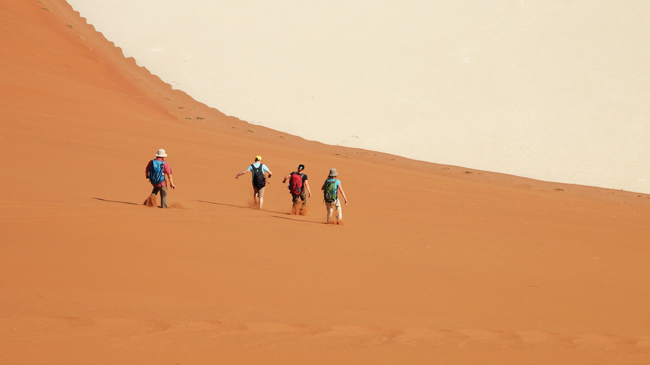 Mit ihren 350 Metern ist sie eine der höchsten Dünen der Erde. Ein Teil der Gruppe gibt sich mit der Little Daddy Düne zufrieden. Der Großteil der Gruppe kämpft sich aber den steilen Dünenkamm zum Big Daddy hoch. Wir haben großes Glück und einen der wenigen, fast windstillen Tage erwischt. Nach einer Stunde sind wir schon oben. Die Aussicht auf die umliegende Dünenlandschaft und das tief unter uns liegende Dead Vlei ist einfach nur großartig. Nachdem wir diese Eindrücke auf uns haben wirken lassen, geht es an den Abstieg. Dieser wird auf gerader Linie den steilen Hang hinab rennend vorgenommen, sodass er nur fünf Minuten dauert. Auch der Abstieg ist ein Erlebnis, mit jedem Meter werden die Schritte schwerer, bis kein Sand mehr in die Schuhe passt. Dann sehen wir das Dead Vlei, diese große Lehm-Ton-Senke mit ihren seit Jahrhunderten abgestorbenen Akazienbäumen vor den roten Dünen. Das stellt alles in den Schatten, was ich an Wüste bisher gesehen habe.
