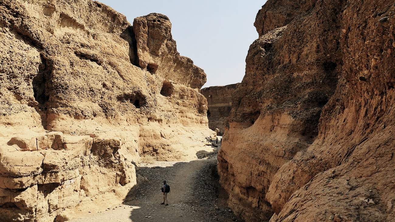 Inzwischen ist es sehr heiß geworden, und so zieht es doch jeden in Richtung Jeeps. Andrea und ich können uns jedoch kaum von der Szenerie losreißen. Nach der kurzen Jeepfahrt geht es mit unserem Bus zurück und als ob das alles noch nicht genug gewesen wäre, biegen wir kurz vor dem Parkeingang noch zum Sesriem Canyon ab. Hierbei handelt es sich um eine ein Kilometer lange und 30 Meter tiefe Schlucht, die teilweise nur zwei Meter breit ist. Inzwischen ist es Mittag geworden, aber die große Hitze hält uns nicht davon ab die Schlucht zu durchlaufen.