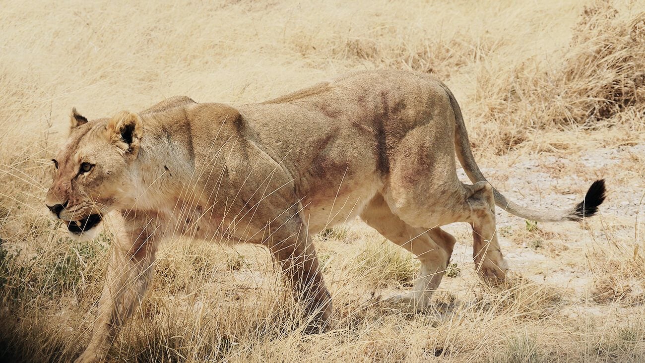 Nach dem Frühstück um 6:15 Uhr fahren wir mit einheimischen Fahrern durch den Park. Sie sind per Funk mit anderen Fahrern verbunden und versuchen uns, vor allem Löwen und Elefanten zu zeigen. Als die Meldung kommt, dass an einem Wasserloch Löwen aufgetaucht seien, fahren wir im offenen Jeep mit Höchsttempo dorthin. Das war es wert, denn es ist wirklich großartig, einen Löwenangriff auf Oryxantilopen zu erleben.
