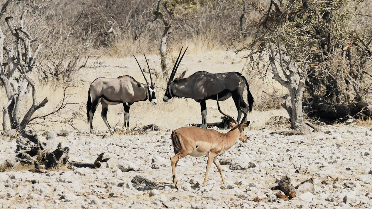- Zwei Oryx Antilopen und ein Schwarznasenimpalabock