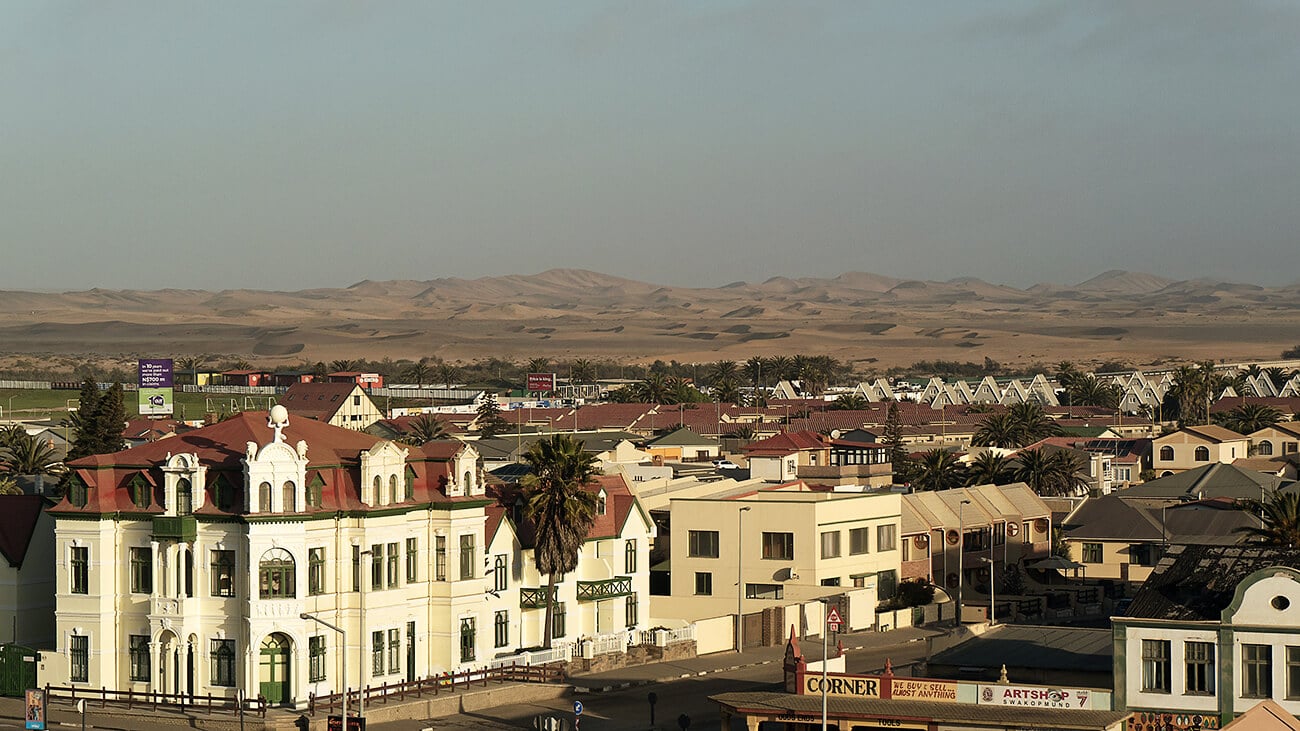 Wir fahren weiter durch die Wüstenlandschaft bis zur Welwitschia-Ebene, dort bewundern wir bis zu 2.000 Jahre alte Pflanzen. Nicht weit davon entfernt beginnt die “Mondlandschaft”, eine absolut vegetationslose, zerfurchte Berglandschaft. Später in Swakopmund angekommen, zieht es Andrea und mich sofort in die Stadt, es gibt so viel zu sehen. Die Stadt wird auch als “südliches, deutsches Seebad” bezeichnet. Hier ist der Kolonialeinfluss noch sehr deutlich zu spüren. Nach der Unabhängigkeit Namibias 1990 und der anschließenden Landreform, sind viele deutsche Farmer nach Swakopmund gezogen, daher ist die deutsche Sprache hier allgegenwärtig. Gerne würden wir in einem der Cafés einen Apfelstrudel, einen Streuselkuchen oder gar eine Schwarzwälder Kirschtorte probieren, aber die Zeit dafür ist leider zu knapp. Wir laufen den Strand entlang, besuchen das Woermannhaus und besteigen seinen markanten Turm, von dem aus man eine schöne Aussicht auf die Stadt und das Meer hat. Die Stadt macht einen total aufgeräumten und sauberen Eindruck auf uns. Es scheint als sei die Zeit stehen geblieben – uns kommt es vor, wie Deutschland vor Jahrzehnten.