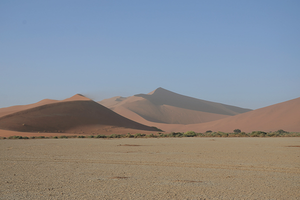 Nach einer kurzen Fahrt in einem offenen 4×4-Fahrzeug starteten wir unsere Wanderung auf die etwa 325 m hohe Düne “Big Daddy”. Der Wind wehte so stark, dass es schwer fiel, das Gleichgewicht zu halten. Der erste der Gruppe “spurte”, der Rest versuchte, in die gleichen Fußabdrücke zu treten, die vom Wind sofort wieder zugeweht wurden. Zwei aus unserer Gruppe kehrten nach der ersten Anhöhe um und entschieden, um die Düne herum zum Dead Vlei zu laufen. Wir anderen führten unseren Weg auf die Spitze fort. Es wurde immer weniger diesig und wir hatten einen atemberaubenden Ausblick auf die braunen Sanddünen um uns herum und die vielen kleinen weißen Vleis, Salztonebenen in einer Senke, in denen sich kein Sand ablagert.