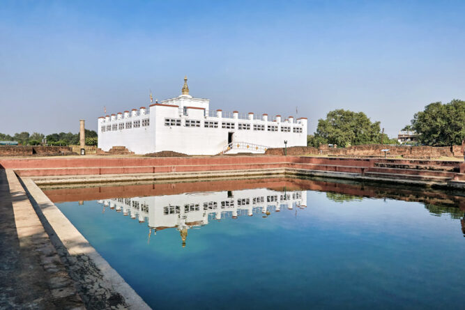 - Der weiße Tempel Maya Devi hinter dem heiligen Teich. Erkennt ihr die kleine Stupa auf der Spitze?