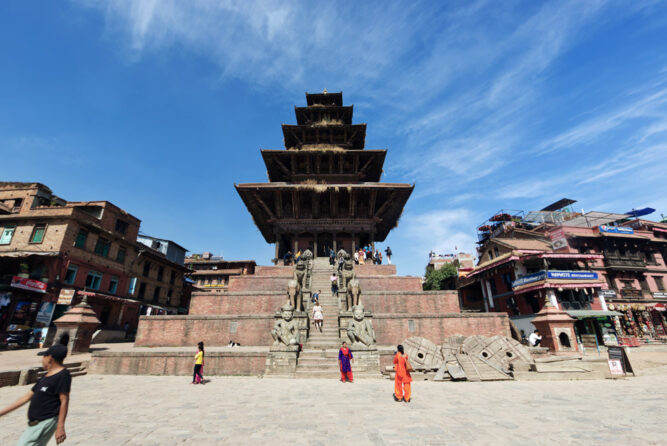 Der Nyatapola-Tempel ist der höchste Tempel im Kathmandutal. Die Pagode ist der Hindu-Göttin des Glücks, Lakshmi, gewidmet. Als erstes ins Auge fallen die fünf Dächer des 30 Meter hohen Tempels. Diese gaben dem Tempel auch seinen Namen, denn Nyatapola heißt übersetzt „fünf Dächer“. Nicht weniger eindrucksvoll sind die kolossalen Steinfiguren, die den Eingang des Tempels bewachen. Dies massive Bauweise hat den Tempel schon einiges überstehen lassen: Die verheerenden Erbeben in den Jahren 1934 und 2015 haben kaum einen Schaden am Nyatapola-Tempel verursacht.
