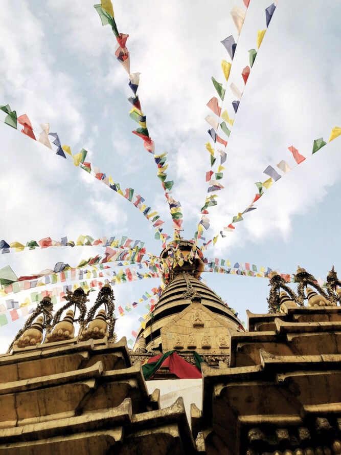 Swayambhunath ist einer der ältesten buddhistischen Tempel der Welt: Schon vor über 2.000 Jahren wurde hier Buddha angebetet. Optisch ähnelt er sehr der Stuba von Bodnath, mit dem goldenen Turm, Buddhas Gesicht und den Gebetsfahnen.