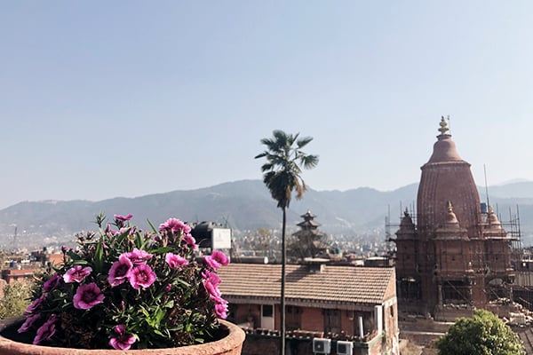 Aufgrund erhöhten Flugaufkommens und dem damit einhergehenden Stau auf der einzigen Start- und Landebahn Kathmandus haben wir fast 1,5h Verspätung. Nach der Kontrolle des Visums, Geldwechsel und Gepäckabholung, wedelt Saugat, mir freudig mit dem ASI Schild entgegen. Nach Ankunft im Moonlight Hotel im Viertel Thamels, der touristischsten Ecke Kathmandus, gehen wir Mittagessen. Es gibt Momos, quasi die Maultaschen Nepals, und Chicken Curry en masse. Spätestens danach prasseln alle neuen Eindrücke über mich herein. Die quirligen Straßen, auf denen unwahrscheinlich viel passiert, sind mit Gebetsflaggen, Wimpeln aus glänzender Folie und Stromkabeln geschmückt.