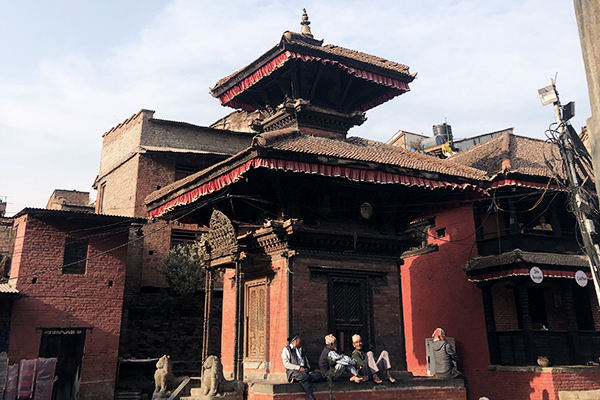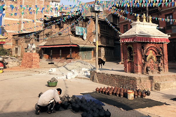 Montags geht es auf die langwierige Rückfahrt nach Kathmandu bzw. Bhaktapur, wo ich abends auf die Gruppe treffe. Am Dienstag mache ich mich schon vor dem Frühstück auf Erkundungstour durch die alte Königsstadt. Dabei kann ich die Einheimischen beim morgendlichen Gebet beobachten. Ich bin begeistert von der bunten, blumenreichen und entspannten Zeremonie, die kurz darauf von hupenden Mopeds abgelöst wird. Auf einem Rundgang durch die Stadt erfahren wir von unserem Guide Sam, so einiges über die Geschichte der Stadt. Nachmittags machen wir uns auf ins „liebliche“ Kathmandutal. Es geht entlang der Straße und schließlich hinauf auf einen Hügel. Dort erwartet uns der Rundgang durch den Tempel in Changunarayan. Im Anschluss gibt es zur Abkühlung Bananen Lassi. Zurück in der Stadt probieren wir den typischen Juju Joghurt, der in Tonschüsselchen als Take-Away serviert wird.