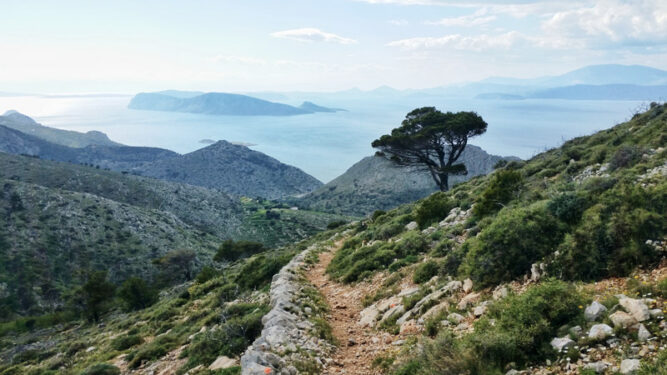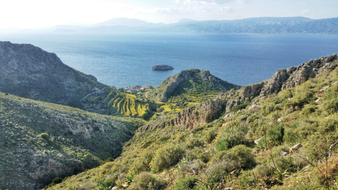 In den nächsten Tagen lernten wir die Autofreiheit auf Hydra sehr zu schätzen. Nicht nur, weil eine Atmosphäre voller Gelassenheit und Ruhe über der Insel schwebte, sondern auch, weil das alte Wegenetz der Insel noch heute genutzt und gepflegt wird. So lassen sich die beeindruckenden Landschaften von Hydra bestens zu Fuß erkunden. Die schönste Tour führte hinauf auf den Berg Eros, der höchsten Erhebung der Insel (588 m). Teils schmale, aber gut ausgetretene Pfade führten uns bis auf den Gipfel, von dem sich wirklich beeindruckende Aussichten boten.