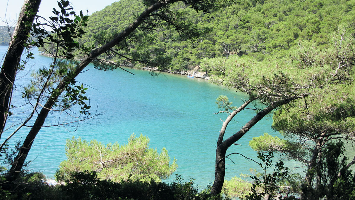 Am nächsten Tag geht es mit Gepäck nach Mljet. Wir freuen uns schon sehr auf diese Insel, sind die Bilder doch sehr beeindruckend. Heute hat man uns auf ein schnelles Katamaran Boot gebucht und nach 1.40 h kommen wir in Polace an. Es gibt unzählige Fahrradverleihe – den Spruch: „Rent a bike – don’t hike“ lesen wir nicht nur einmal – trotzig machen wir uns doch zu Fuß auf den Weg. Die Wanderung führt uns um den großen Salzsee (Veliko Jezero) und ist einmalig schön! Üppigste Vegetation soweit das Auge reicht und die Route führt uns abseits der Wege teilweise durch eine dschungelartige Landschaft und ein Durchkommen scheint unmöglich. Der See ein Gedicht mal in türkisblau mal in schimmerndem Grün.