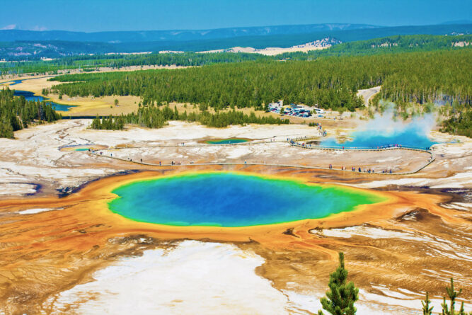 Einen besonderen Platz in dieser Liste verdient sich der Yellowstone-Nationalpark als ältester Nationalpark der Welt und UNESCO-Weltnaturerbe. Er ist einer der größten Nationalparks der USA und bekannt für seine Vielzahl an blubbernden, geothermalen Quellen, von denen es hier rund 10 000 gibt. Er beherbergt über 60 Prozent aller heißen Quellen weltweit, Grand Prismatic Spring ist die bekannteste heiße Quelle aus dem Yellowstone-Nationalpark, die größte Quelle der USA und drittgrößte der Erde. Neben tausenden solcher Quellen erlebst du im Yellowstone-Nationalpark eine vielfältige Tier- und Pflanzenwelt und eine wunderschöne und weite Landschaft.