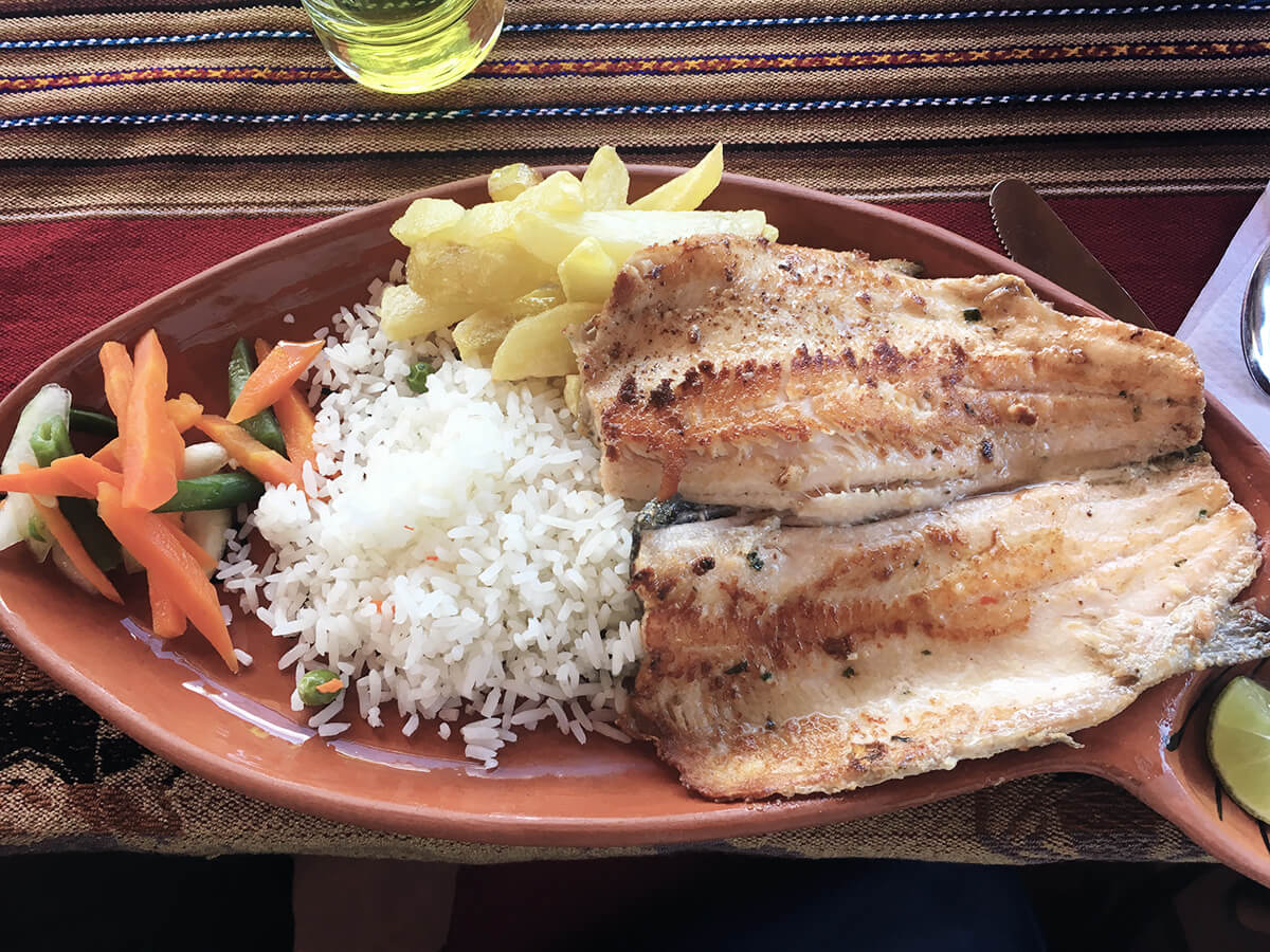 Am Nachmittag schipperten wir wieder zurück nach Puno. Auch wenn der Titicacasee auf über 3.800 Metern liegt, waren die Temperaturen tagsüber ziemlich hoch – und wir etwas geschlaucht. Bei einer Flasche peruanischem Rotwein, Ceviche (roher Fisch mit Limettensaft mariniert) und gegrillten Forellen im Restaurant Mojsa im Herzen Punos ließ ich mit meiner Frau den Tag gebührend ausklingen.