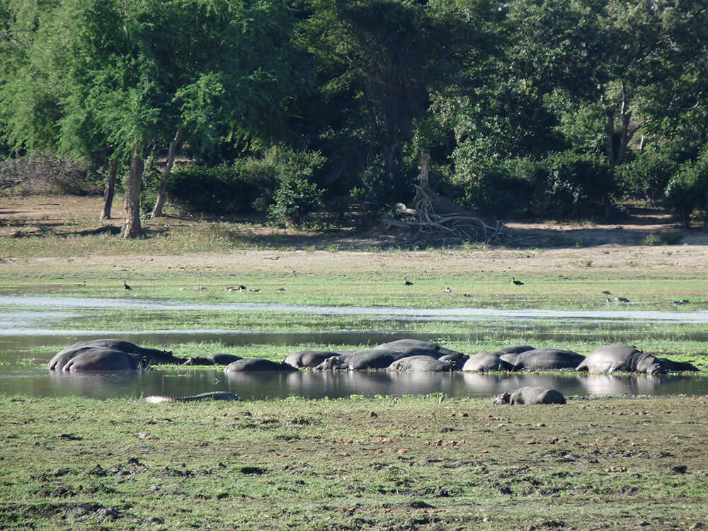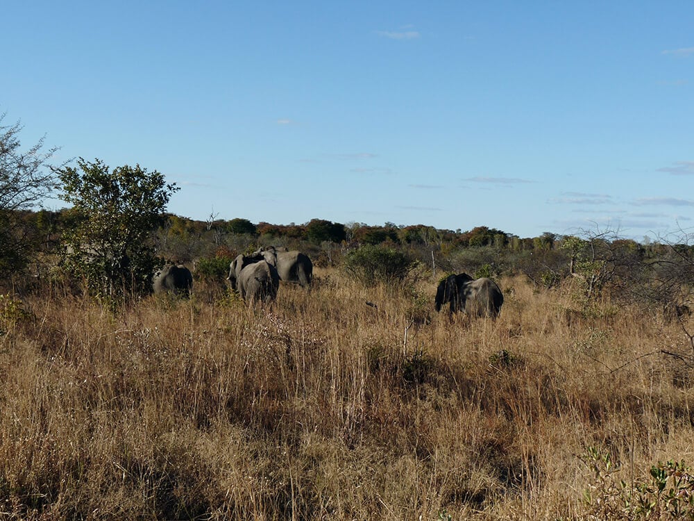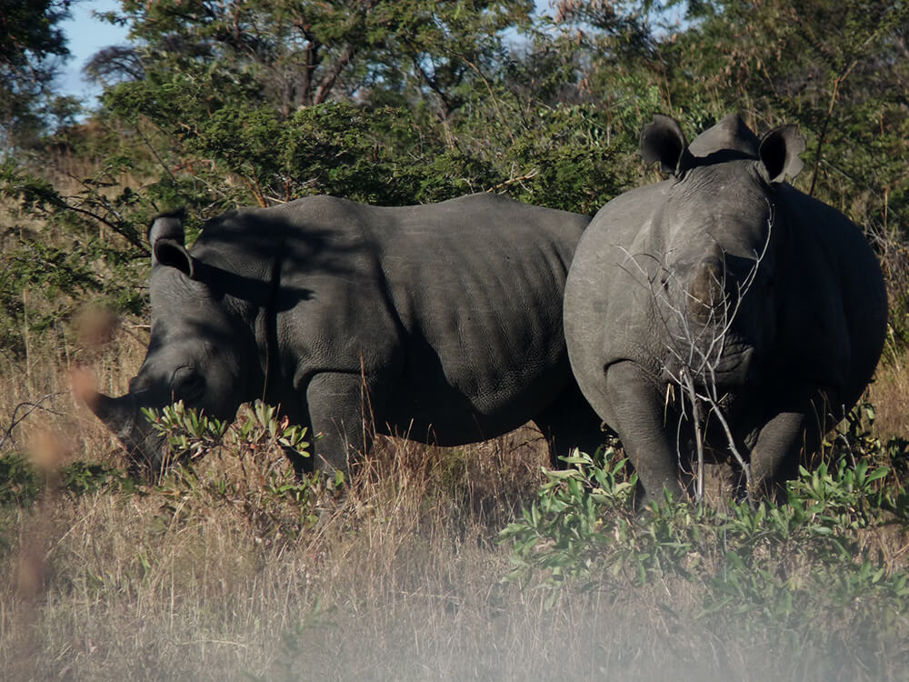 Wir bewegen uns langsam, sehr langsam, niemand aus unserer 8-köpfigen Gruppe spricht ein Wort. Nur unser Ranger Kevin gibt uns flüsternd Anweisungen. Wir achten darauf, dass kein Zweig unter unseren Schuhen knackt und bleiben dicht beieinander. Eine sanfte Stille umgibt uns. Die Spannung steigt. Der Wind steht günstig, sie können uns nicht wittern. Vorsichtig verlassen wir das uns Deckung gebende Dickicht und sehen sie plötzlich direkt vor uns: zwei imposante Spitzmaul-Nashörner, Riesenkolosse im Verhältnis zu unserem Grüppchen von Menschen. Eines ist noch ein Kalb, aber kaum kleiner als seine Mutter. Ich fühle wie mein Puls deutlich schneller wird, als wir nur mehr ca. 15 m von diesen beeindruckenden Tieren entfernt sind. Solange wir zusammenbleiben halten uns die Nashörner für ein einziges Tier, das sie wegen seiner Größe nicht angreifen würden, versichert uns Kevin. Ehrfürchtig folgen wir angespannt jeder Bewegung der beiden. Es ist unglaublich, wie liebevoll diese Riesen des Busches miteinander umgehen, wie zärtlich die Mutter ihr Kalb liebkost.
