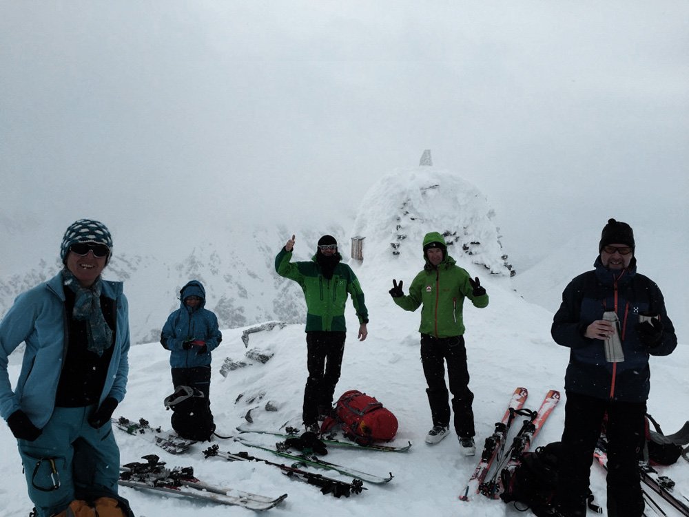 Angekommen bei der Hütte machten wir eine kurze Rast und stärkten uns mit dem in der Lodge zubereiteten Lunchpaket. Bei idealem windgepressten Pulverschnee wählte Stefan über den Osthang die perfekte Aufstiegsspur in dem zwischen 30° und 35° steilen Gipfelhang. Nach einer Gehzeit von 3,5 Stunden und 1.150 Höhenmeter mehr in den Beinen erreichten wir den Gipfel. Der Ausblick, die Sonne, die Ruhe ließen sofort alle Mühen vergessen und belohnten uns für den Aufstieg. Nach einem einstündigen Auffrischungskurs in der Lawinenkunde stiegen wir noch einemal ca. 100 Hm auf um eine gute Abfahrtslinie zu bekommen. Es war eine absolute Traumabfahrt, die uns wirklich alle für die Anstrengungen des Aufstiegs belohnte!