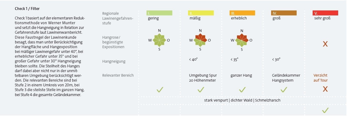 Grundsätzlich gibt es in der Lawinenkunde unterschiedliche Herangehensweisen, um das Risiko und die Sicherheit im Gelände abzuschätzen. Zu beachten ist allerdings, dass jede getroffene Entscheidung immer nur so gut ist wie die Handlung, die davon abgeleitet wird. Leider ist es oftmals gar nicht so einfach Entscheidungen zu treffen – vielleicht macht uns der komplexe Aufbau der Schneedecke unsicher oder wir haben Schwierigkeiten theoretisch erlerntes Wissen aus der klassischen Lawinenkunde in die Praxis umzusetzen. Deshalb haben viele Experten in diesem Bereich, allen voran der Schweizer Werner Munter, neue Ansätze zur Lawinenkunde entwickelt. Diese basieren zumeist auf den folgenden drei Bausteinen: