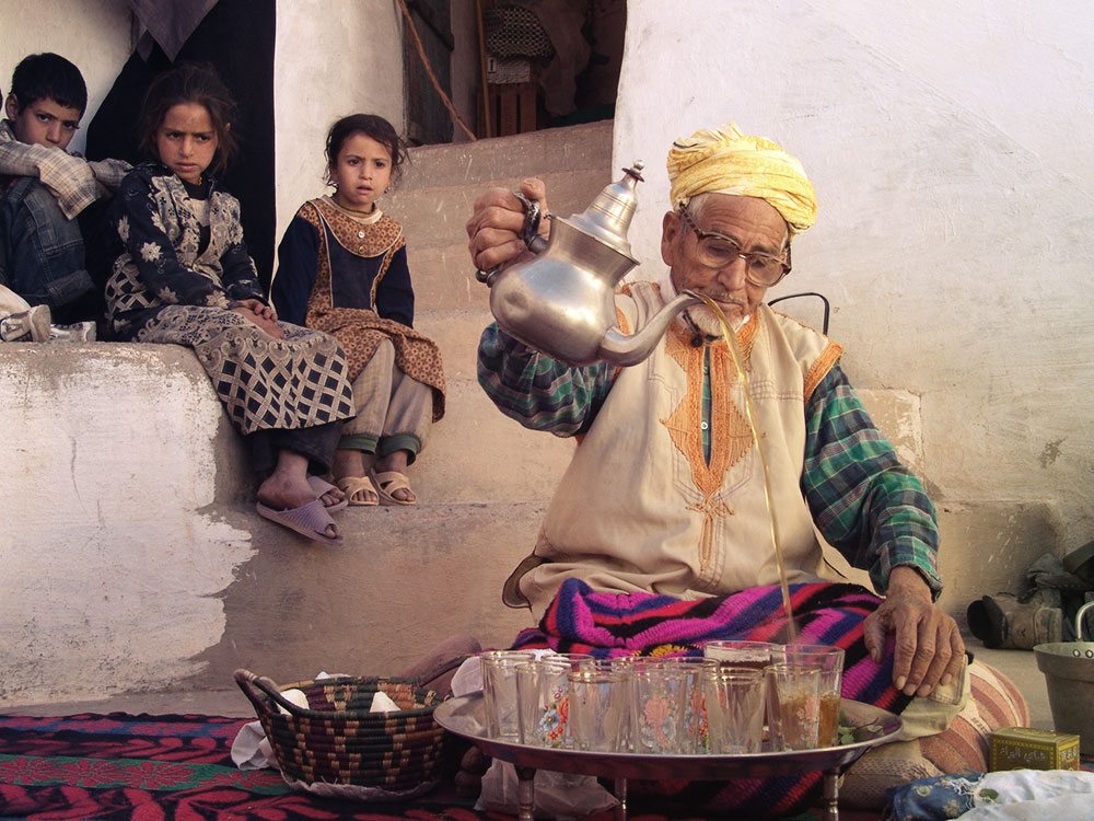 - Der Dorfälteste beim Tee einschenken