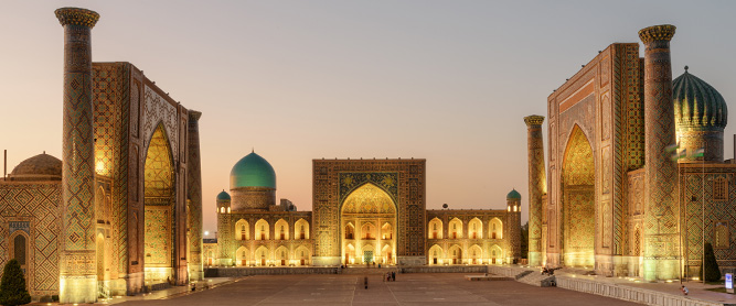 - Registan: Als „berühmtester Platz des Orients“ bezeichnetes Zentrum und Herz der Stadt, der von drei aufwendig verzierten Medresen umrahmt und am Abend von einer Licht- und Soundshow untermalt wird.