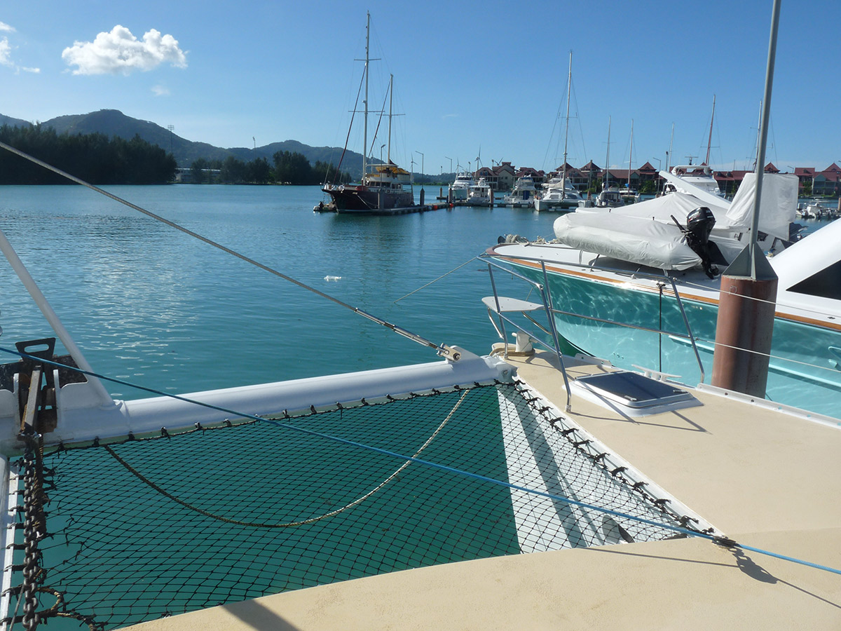 Blick auf Eden Marina und die Inseln des St. Anne Marine Parks