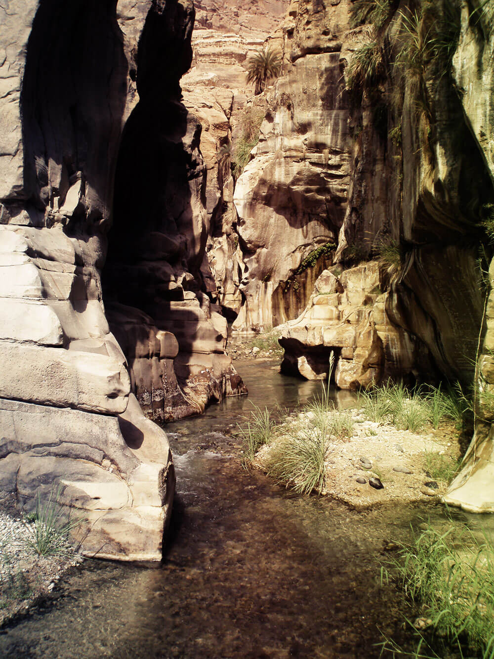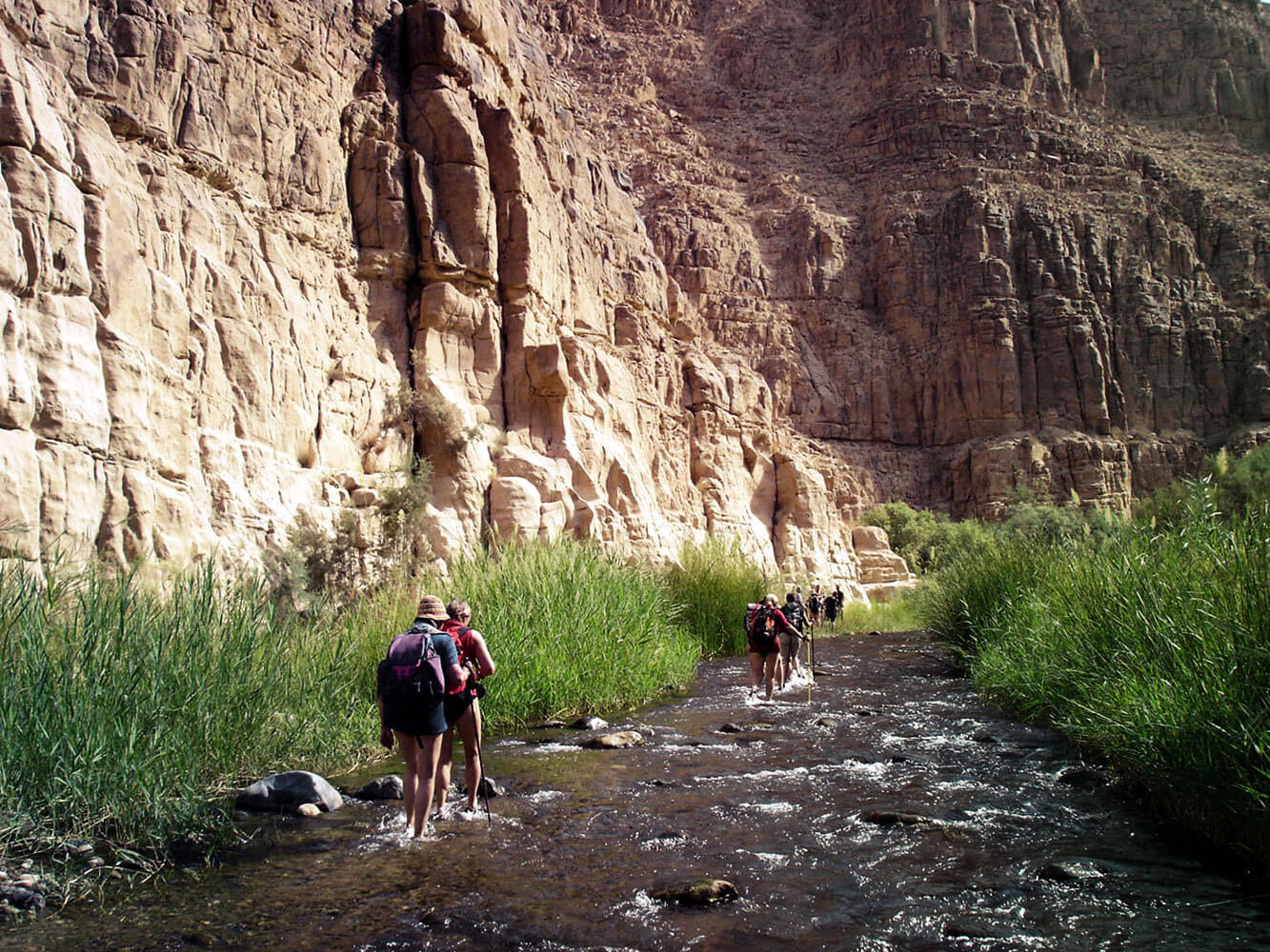 Neben den berühmten Highlights des Landes begeistern aber gerade auch die weniger bekannten Gegenden. Nahe gelegen am Toten Meer befindet sich die Wadi Mujib mit tief eingeschnittenen Schluchten und Felsformationen. Auch als „Grand Canyon Jordaniens“ bekannt ist die Wadi Mujib noch wenig besucht und bietet ein wahres Naturspektakel. Erst durchwandert man ein Flussbett mit außergewöhnlicher Vegetation, bevor man durch die Schlucht im Schatten der steilen Sandsteinfelsen wandert. Der Ausblick auf das Tote Meer, die Sandsteinformationen und die tief eingeschnittenen Schluchten begeistern.