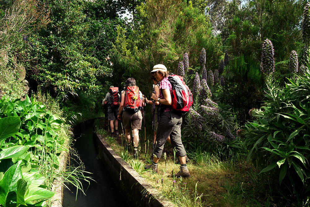 - Levadas: Die Bergkette entlang der Nordküste bildet eine natürliche Barriere gegen die Nord- und Nordostwinde, deswegen ist dieses Gebiet von sehr viel Niederschlag und somit Wasserreichtum geprägt. Die Nutzung dieser Ressourcen ist jedoch durch sehr steiles Gelände kaum möglich. Bereits im 15. Jahrhundert wurden auf Madeira die ersten Bewässerungskanäle angelegt . Das ausgeklügelte Bewässerungssystem der Insel besteht aus ca. 1.400 km (Angabe des Fremdenverkehrsamt Madeiras) schmalen Kanälen, die das Wasser in die trockeneren Gebiete und auf die Felder transportiert. Neben dem offenen Kanal verläuft meist ein schmaler Fußweg, auf dem Wanderer ohne große Anstrengungen in die entlegensten Gebiete vordringen, wegen seitlicher Abgründe mitunter jedoch schwindelfrei sein sollten.