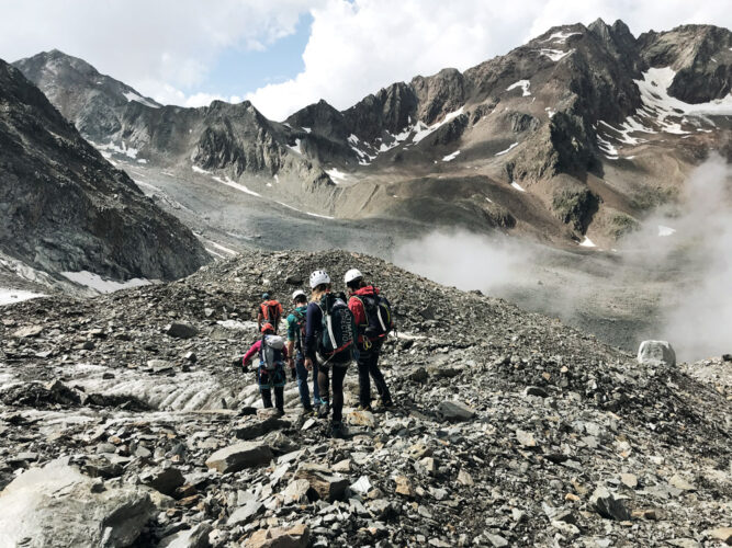 Nach einem leckeren Frühstück starten wir unsere erste Wanderung zum Gletscher (Taschachferner). Das Erlernen des richtigen Umgangs mit Steigeisen, Pickel und Eisgeräten steht an, welche Knoten in welcher Situation verwendet werden müssen und wie man sich in einer Seilschaft verhaltet.