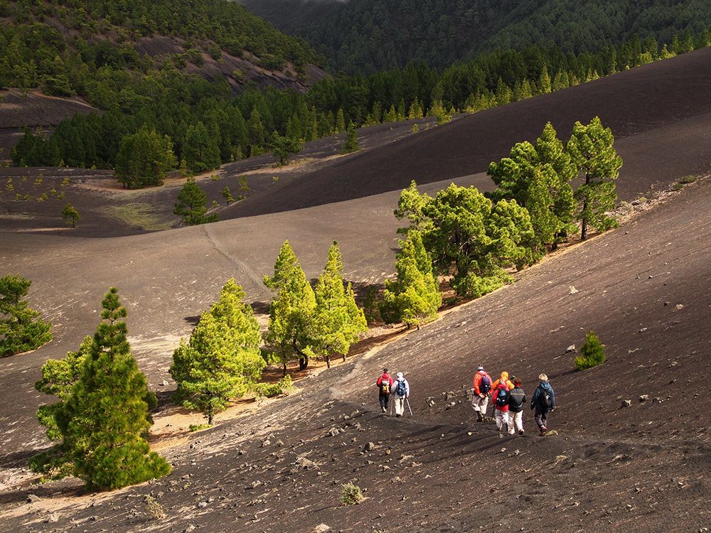 Höhepunkt jedes Besuchs auf La Palma ist die Tour in die Caldera de Taburiente: Bis zu 2.000 Meter hohe Wände umschließen den im Durchmesser acht Kilometer großen Kessel. Der Weg läuft durch einen uralten Kiefernwald, die Nadeln der Bäume haben einen weichen Teppich ausgelegt, dazwischen öffnet sich immer wieder der Blick auf die zackigen Wände der Caldera, bis man schließlich den Talgrund erreicht. Hier ist das Herz der Insel: Im Hintergrund die steilen Felsen, im Vordergrund der Kesselboden mit seinen kleinen Bächen, die den Weg ins Tal suchen, schöner kann man ein Gemälde nicht malen.