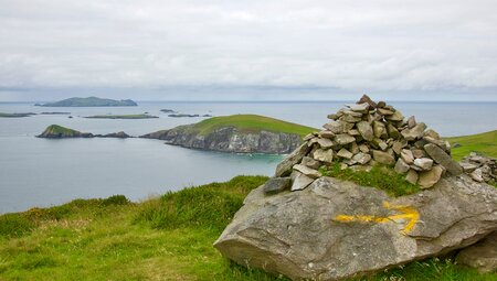 <Die vierte Etappe des Dingle Way führt dich stets der Küste entlang, teils auf ruhigen Straßen, teils direkt am Strand. Pack dir in Dingle Proviant für ein Picknick ein, denn der Weg nach Dunquin bietet großartige Ausblicke auf grüne Hügel, Klippen und das Meer. Du verlässt Dingle und gehst nach Ventry, wo du am Strand weiterwanderst. Immer wieder wirst du an Aussichtspunkte gelangen, die zu einer Pause einladen. Der Mount Eagle erhebt sich rechts von dir, und wenn du genug Zeit hast, kannst du den Gipfel für eine beeindruckende Aussicht erklimmen. Den Tag über genießt du den Blick auf die wilde Küstenlandschaft und erreichst schließlich das kleine Dunquin.