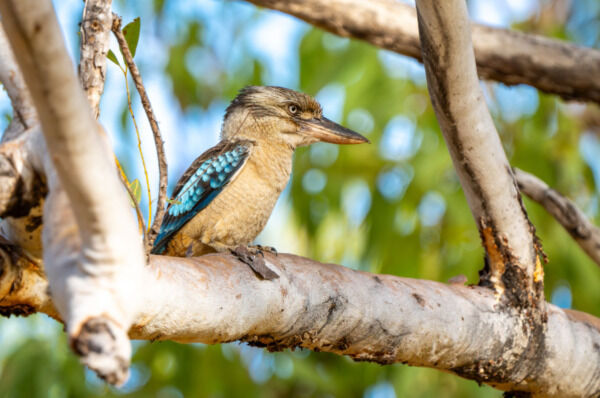 Auch der Blauflügelkookaburra ist ein typischer Vogel Australiens und gut an seinen leuchtend blauen Flügelspitzen zu erkennen. Er bevorzugt den Norden und Westen Australiens, reist aber auch bis nach Neuguinea. Er ernährt sich in der Regenzeit von kleinen Reptilien und Insekten, benötigt für sein Nest jedoch ausgesprochen hohe Bäume. Deren Verlust durch Rodung oder Waldbrand stellt also ein existenziellen Problem dar.