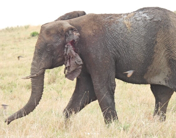 Solche Fallen werden eigentlich für Antilopen gestellt, doch sie fangen wahllos jedes Tier, das ihnen begegnet. Für viele Tiere kommt jede Hilfe zu spät. Diese Elefantenkuh hatte Glück: Unsere Kollegen schickten Ranger und Tierärzte, die sie rechtzeitig finden und behandeln konnten. Allerdings waren große Teile vom Ohr nicht mehr zu retten. Die Tierärzt gehen davon aus, dass sich die Elefantenkuh erholen wird, aber sie ist dauerhaft durch diese Verletzung gezeichnet.