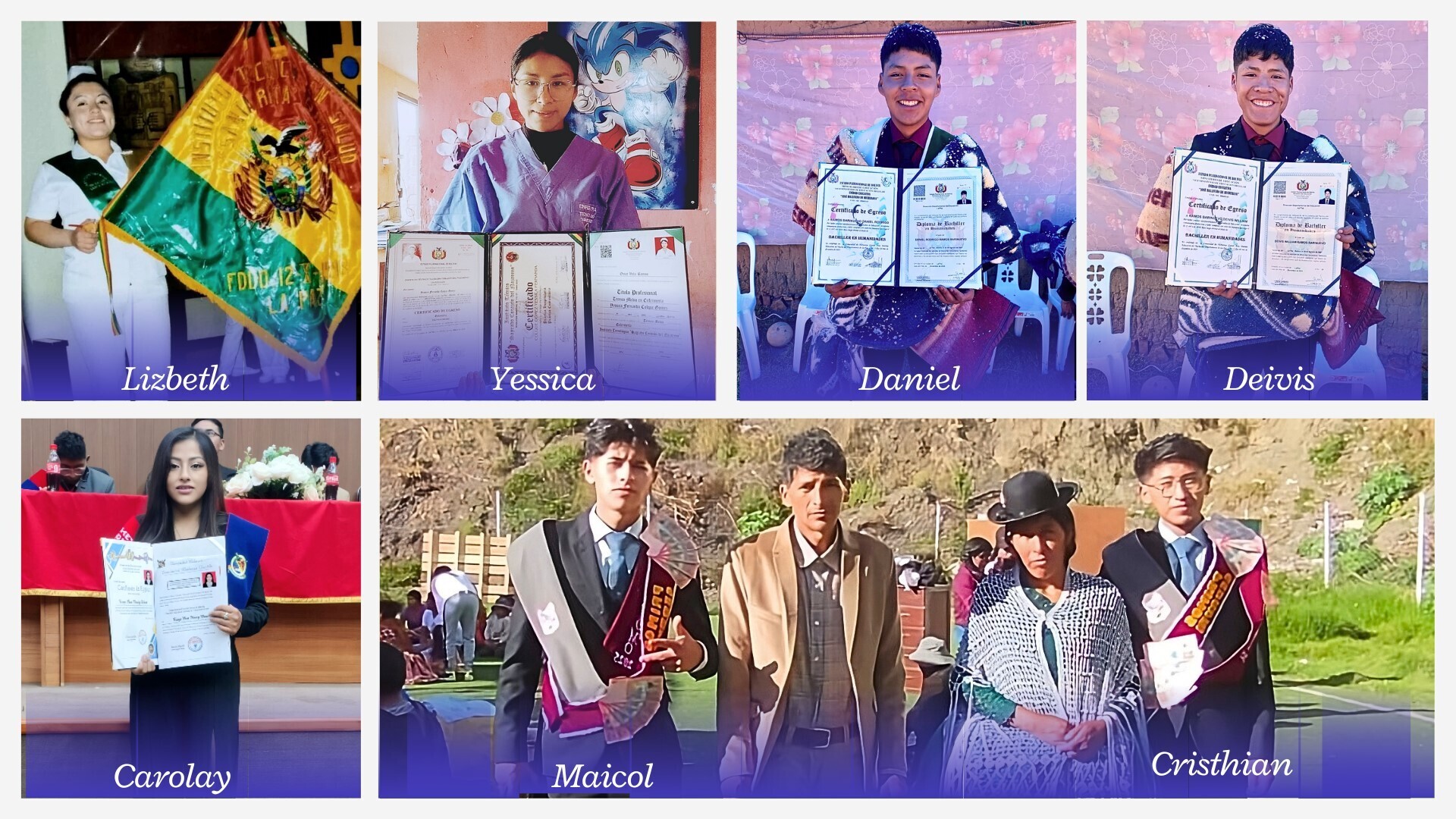 Lizbeth graduated as a Tecnico Superior in Nursing from the Instituto Tecnico En Salud Santa Rita. She is already working as a nurse, providing care for an elderly woman. Looking ahead, Lizbeth plans to continue her studies at a university, where she hopes to transfer credits and pursue a Bachelor’s degree in Nursing.Yessica graduated as a Tecnico Superior in Nursing from the Sagrado Corazón Institute. At present, she is seeking additional training courses to complement her education and aims to enter the workforce as soon as possible in order to gain professional experience.Daniel and Deivis, twins, graduated from high school in the high-altitude community where they were born and raised. They plan to complete their mandatory military service in 2026.Carolay graduated from the Public University of El Alto city with a degree in Early Childhood Education. She is very grateful for the opportunity to complete her studies and is currently looking for a position in an educational institution where she can begin practicing her profession.Maycol and Cristhian graduated from high school in a rural community called Sorata. Maycol plans to study Nursing at the Universidad Catolica of Sorata and is currently preparing for the university entrance exam. Cristhian plans to work while studying Public Accounting at the Universidad Mayor de San Andrés, where he will take his entrance exam in January.